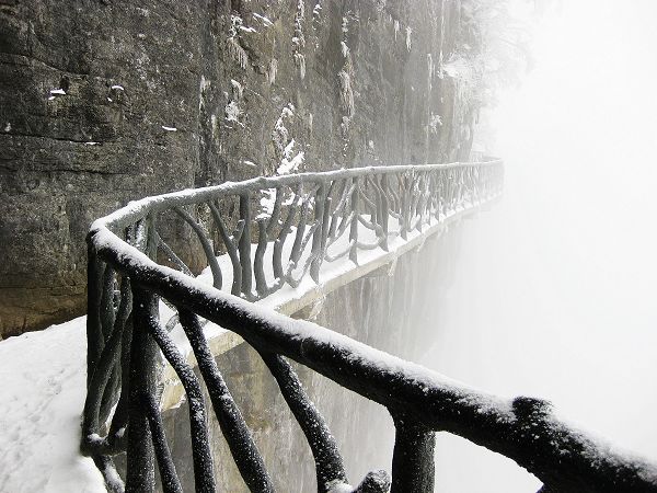 順著路一直走走拍拍,連不愛照相的俺都忍不住吆喝著來一張來一張。俺兄弟一邊拍一邊不惜余力地打擊俺:您老就別糟踐這美景了。走在鬼谷棧道,一側是山壁,一側是霧氣籠罩的懸崖,后來又下起雪來,真有點深山求仙的味道。其實一路走來并不累,就是總不得不從被冰掛壓倒的樹下鉆身而過,累得腰酸。再有就是俺一度說要雪盲了,眼睛都有點發(fā)花。最后終于到了頂端的天門山寺。確實要承認,在這樣的一番情景之下,佛性也顯得格外深沉,連那個向來不信的家伙也雙手合十。本來還想隨喜瞻仰一下佛祖真身舍利的,可被那個賣票的痞子樣給雷到而作罷。