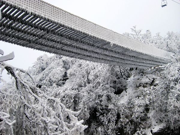 由于淡季,不用排隊很快坐上了索道,前前后后的轎廂內(nèi)都沒人,俺倆坐著好不優(yōu)哉。索道漸次翻越而后陡然爬升,進入乳白色的氤氳之中,最后全被濃厚的霧氣包裹,像在云霧中漂移。俺又爽又驚,心想神仙還真不是好當?shù)摹?粗懊娴牟僮髡f明:沒事,這個挺先進的,碰到惡劣天氣會自動停止運行。話音剛落,它就停了,然后左右左右的晃啊晃啊。俺顫顫地問:怕嗎?他說:嗯……還,還成。俺喃喃地道:靠,俺可不想死呢……終于正襟危坐地熬過了那幾分鐘的晃悠,繼續(xù)上行后,霧氣淡了許多,這才看到索道支架和輪軌竟然都凍上厚厚的冰掛。心肝一顫:不是吧,這是到哪了啊?!