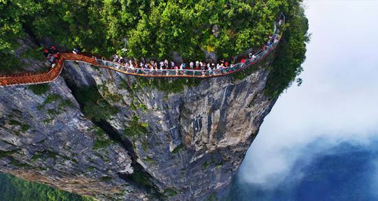 棧道全長(zhǎng)1600米,平均海拔為1400米,起點(diǎn)是倚虹關(guān),終點(diǎn)到小天門。與其他棧道不同的是,鬼谷棧道全線既不在懸崖之巔,也不在懸崖之側(cè),而是全線都立于萬(wàn)丈懸崖的中間,給人以與懸崖共起伏同屈伸的感覺(jué)。 站在棧道上俯瞰群山,古人“會(huì)當(dāng)凌絕頂,一覽眾山小”的感覺(jué)油然而生。由于天門山是國(guó)家森林公園,植被特別豐富,加上典型的喀斯特地貌,所以,在這條棧道上更能找到一種在乘坐直升飛機(jī)飛越熱帶雨林大峽谷的感覺(jué),這平時(shí)只能在電影里看到的場(chǎng)景,在這里能讓你身臨其境。 由于海拔和氣流的影響,很多小鳥(niǎo)都不能到達(dá)與棧道平行位置。所以,站在這里,腳下是沒(méi)有邊際的綠野,成群的小鳥(niǎo)在峽谷中嬉戲,偶爾有老鷹從眼前掠過(guò),閉上眼,挺著發(fā)麻的雙腿,帶著急促的心跳,伸開(kāi)雙臂,你就能得到一次最完美、最刺激、最貼近自然的SPA。因?yàn)?,要知道這種在懸崖上賞風(fēng)景一般都是非人類所能享受的。 如果是雨前雨后,在棧道上則是身邊霧氣盤繞,腳下云海翻騰,令人抬腿似生霧,邁步如踏云,人間天界,世外洞天也就是如此了。 據(jù)施工人員介紹,此條棧道也是他們所修棧道中施工最難,最險(xiǎn)峻的一條。如果您還覺(jué)得不夠刺激的話,在棧道的完結(jié)處的兩個(gè)懸崖之間有一條長(zhǎng)160米的懸索吊橋,同時(shí),在海拔最高點(diǎn)還有一個(gè)挑戰(zhàn)心里極限的玻璃站臺(tái),在這里,如果你能挺直腰板伸開(kāi)雙臂,那么,您就是真正的勇士了。